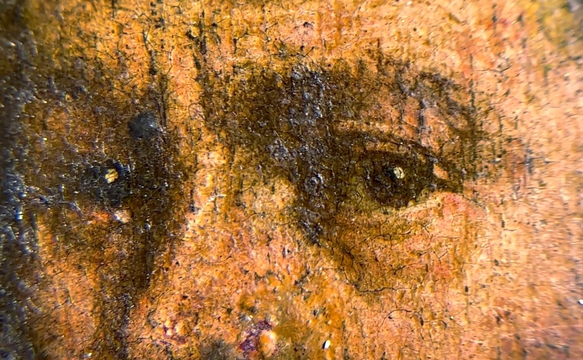 Записи удаляю с картины, и открывается авторская краска. Видны утраты с подведенным реставрационным грунтом белого цвета. Авторский грунт здесь - цветной, серо-охристый. Покажу вам сейчас остатки записей. Открываются утраты, которых не было видно. Достаточно много утрат открылось в процессе реставрации на такой маленькой картине. Вот это все белое - реставрация, которая была предыдущая.
