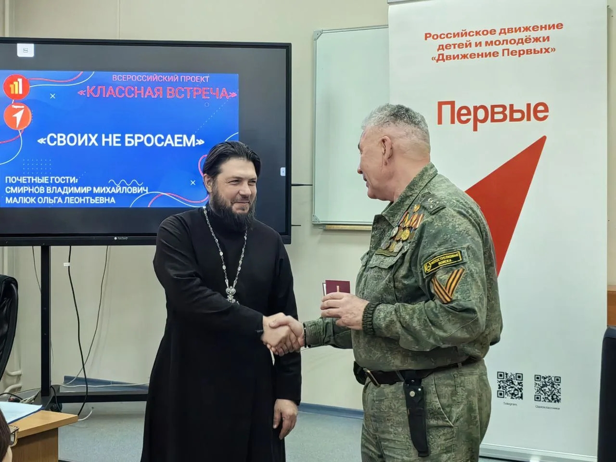 2 декабря 2025 года в МБНОУ «Лицей №111» г. Новокузнецка состоялась классная встреча в рамках Всероссийского проекта по теме «СВОих не бросаем». С учащимися встретились почетные гости: - участник СВО, ветеран боевых действий Владимир Смирнов (позывной – капитан Мирный); - руководитель отдела по делам молодежи Новокузнецкой епархии протоиерей Андрей Рузанов; - руководитель городского поэтического клуба ветеранов педагогического труда «Муза» г. Новокузнецка Ольга Геннадьевна Малюк и ветераны-поэтессы клуба «Муза». Капитан Мирный ответил на вопросы учащихся и рассказал о героических буднях воинов на передовой, о задачах в тылу для помощи фронту, о необходимости оказания гуманитарной поддержки детям Горловки, Донбасса и Новороссии, а также поблагодарил учеников и учителей лицея за участие в акции Администрации г. Новокузнецка «Собери Новогодний и Рождественский подарок детям Горловки и воинам на СВО». Отец Андрей рассказал учащимся и учителям классной встречи про социальную работу Новокуз