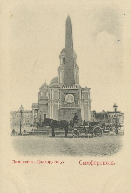 Симферополь. Памятник Долгорукову. Начало ХХ века Открытое письмо Очень красивый ракурс фото - Долгоруковский монумент на фоне Александро-Невского собора. И извозчик. Фотограф - молодец! #Симферополь #транспорт #извозчик #архитектура