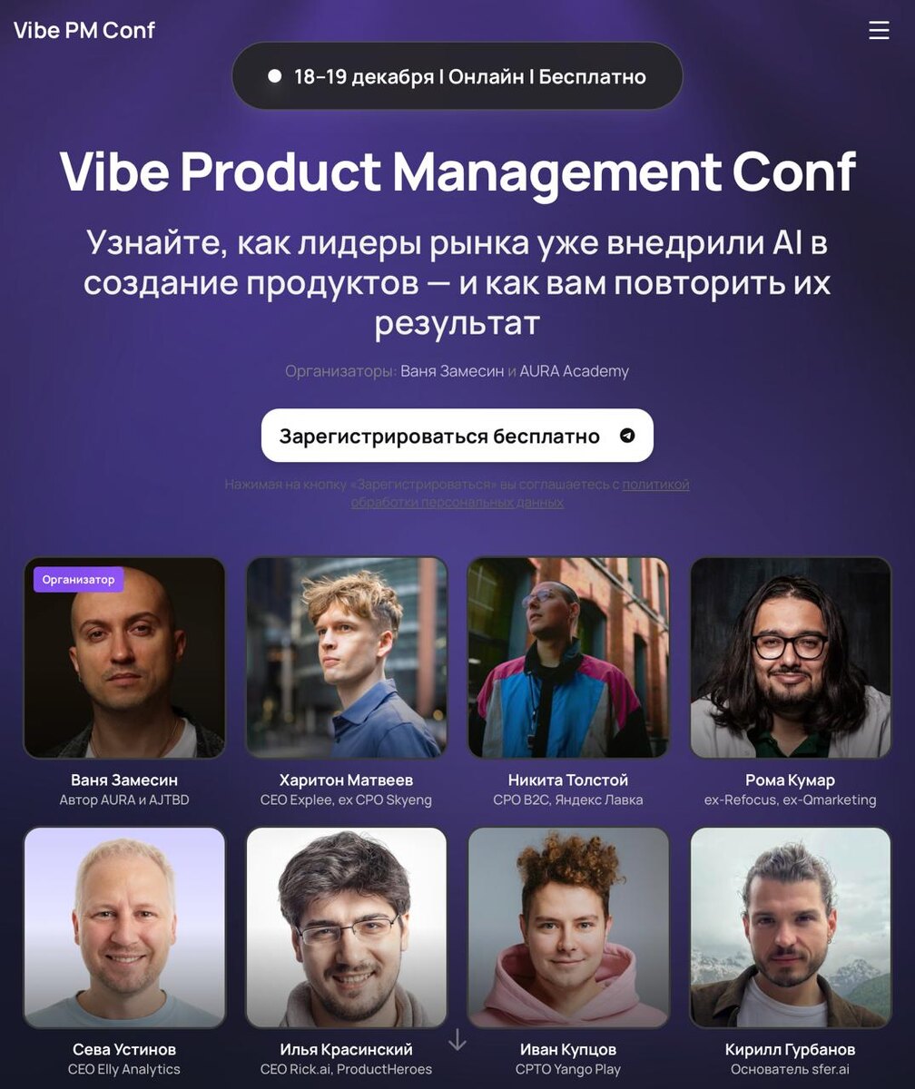 Vibe Product Management: приглашение на конференцию Дорогие читатели, приглашаю вас на бесплатную онлайн-конференцию, посвященную применению ИИ в работе продакта, организованную легендарным Ваней Замесиным Имею честь выступать с докладом про то, как цифровая копия продукта ускоряет продуктовый процесс Предыдущие посты-прогрев на тему доклада: - https://dzen.ru/media/nikita_tolstoy/novyi-prodaktmenedjment-68f9191910d0ef08b50a93e2 - https://dzen.ru/media/nikita_tolstoy/chem-zaniatsia-v-prazdniki-programmirovaniem-6905063bc79abf20c6056ca2 Сам останусь на весь эвент, чтобы послушать и остальные доклады! Регистрация: через Телеграм-бота Вани: @zamesin_bot До встречи в Зуме! P.S. Больше таких постов по хештегу: #vibe_coding