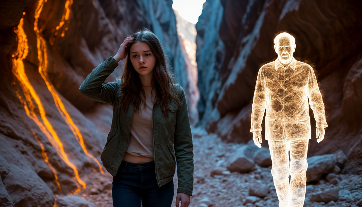 И именно в этой точке максимального sensory overload он впервые появился. Не голос в голове. Фигура. В полуметре слева, на периферии зрения, мелькнула тень. Высокая, сутулая, в знакомом потёртом кардигане. Она обернулась — никого. Сделала шаг — тень снова мелькнула, теперь справа, будто идущая параллельно, по другой стороне ущелья, которой физически не существовало.