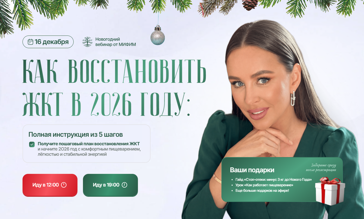 На вебинаре разберём: Пошаговый план восстановления ЖКТ: 5 ключевых сфер, которые нужно наладить, чтобы увидеть результат к Новому Году: питание, гормоны, детокс, нервная система, желчный и печень Главные разрушители кишечника: какие ошибки в питании и образе жизни крадут вашу энергию и молодость, и как их устранить Секрет чистой кожи и максимального усвоения: как перезагрузить работу ЖКТ, чтобы ваша кожа стала чистой, а усвоение жиров и витаминов — максимальным Комфорт и снижение веса без диет: как вернуть комфортное пищеварение и снизить вес без строгих диет Экспресс-диагностика организма: как определять, где у вас произошел сбой, чтобы не тратить деньги на ненужные анализы и добавки