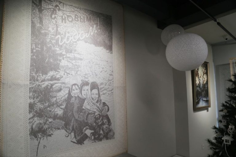 Удивительное панно размером 240 на 160 сантиметров заняло одно из центральных мест в экспозиции «Три возраста платка». На белом пуховом полотне вывязан рисунок, повторяющий новогоднюю открытку 1961 года. В центре композиции – малыши на санках и, разумеется, в платке. Создать диковинную вещь смогли мастера Фабрики оренбургских пуховых платков. Дизайнер сумела адаптировать старое фото к переносу на пушистый носитель, а точные машины – воспроизвести рисунок в вязке. Новогоднее панно-открытка стало подарком Галерее и гостям выставки. Интересно, что редкая открытка – тоже часть музейного собрания. Много лет специалисты Галереи пополняют коллекцию фотографий «ХХ век в платке». Часть снимков куплены у коллекционеров, часть – подарены владельцами со всей России. Снимки объединяют пуховые платки и паутинки в кадре, ведь задача коллекции – показать, как старинный оренбургский промысел существует в нашей повседневности. Сейчас в собрании Галереи более тысячи тематических снимков. Часть из них мож