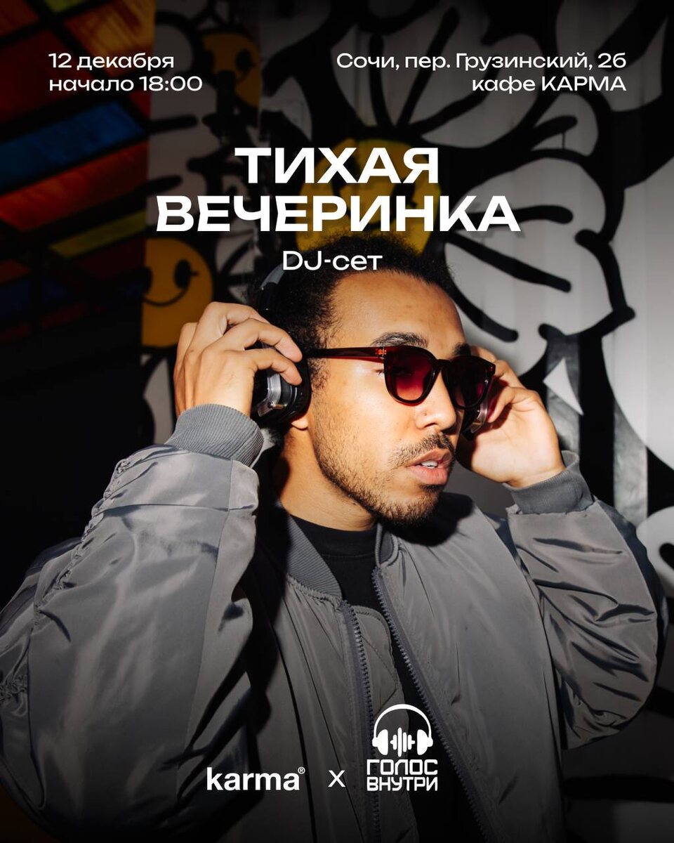 Тихая вечеринка в эту пятницу! KARMA и ГОЛОС ВНУТРИ представляет новый формат! 12 декабря в 18:00 Надеваем наушники, слушаем супер диджей сет и дЭнсИм пер. Грузинский, 2б Вход свободный. Количество участников всего 40 Записаться тут