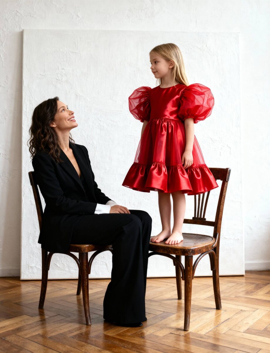 #семейный 1. заходим в Бот 2. выбираем nano banana 3. прикрепляем ваше фото где хорошо видно лицо и вставляем промпт: minimalist studio portrait: mother in black pantsuit seated on a vintage wooden chair, smiling up and holding her daughter standing barefoot on the seat. Girl with wavy hair wears a vivid red organza/taffeta dress with voluminous puff sleeves and a bell skirt. Bright neutral studio with textured white wall and canvas, warm herringbone parquet. Soft natural side window light, clean film-like grade, red dress as the main color accent. Negative: harsh on-camera flash, clutter, oversaturation, wide-angle distortion, heavy skin smoothing. Промпты для фотосессий
