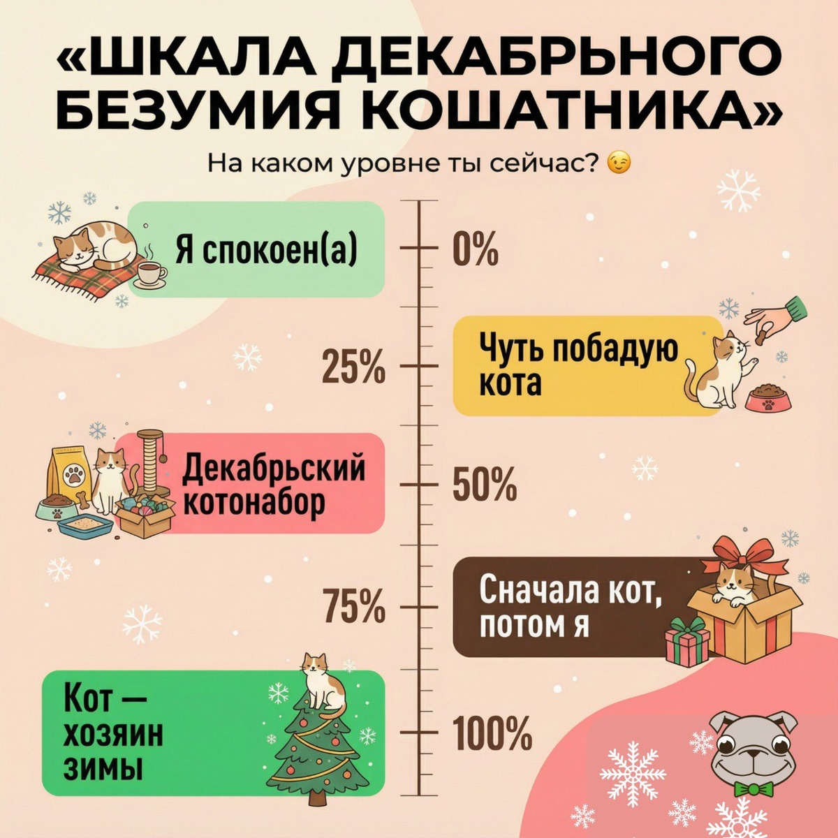 Мы собрали «Шкалу декабрьного безумия кошатника» — от спокойного человека до того, у кого кот официально хозяин зимы