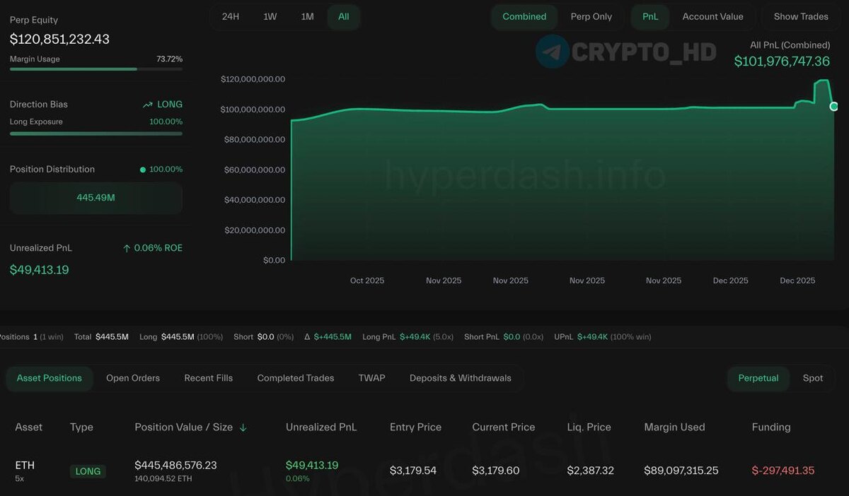 🤨 Инсайдер Bitcoin OG продолжает наращивать свой лонг по #ETH с 5х плечом. Объем позиции: $445,400,000+. Точка входа: $3179. Ликвидация: $2387 (кошелек) Crypto Headlines