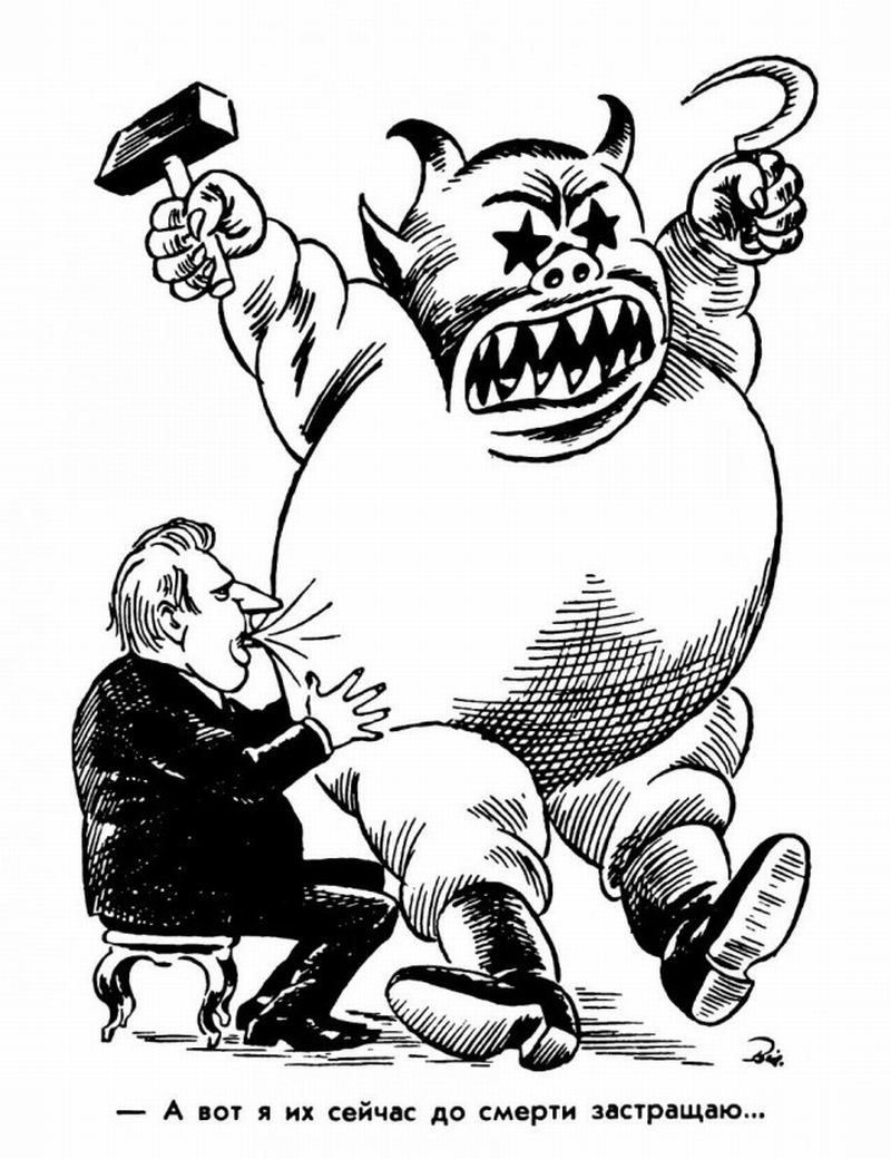 Продолжаем обзор творчества датского художника-коммуниста Херлуфа Бидструпа (1912—1988). Художник пережил нацистскую оккупацию своей страны, работал в подполье, и поэтому очень чутко замечал возрождение фашизма в послевоенной Европе и на Западе. Замечал — и едко высмеивал в своих рисунках. Фашизм тесно связан с антикоммунизмом и военным психозом, который нагнетался в «свободном мире» с первых послевоенных лет.