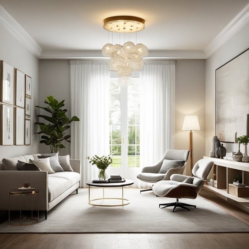 Размер люстры также играет важную роль. Она должна гармонично вписываться в пространство - слишком крупная люстра может визуально уменьшить комнату, а маленькая будет потеряна на фоне больших площадей. Рекомендуется выбирать люстру, диаметр которой составляет одну треть ширины стола или зоны, где она будет размещена. Так вы создадите сбалансированное и уютное освещение в гостиной.