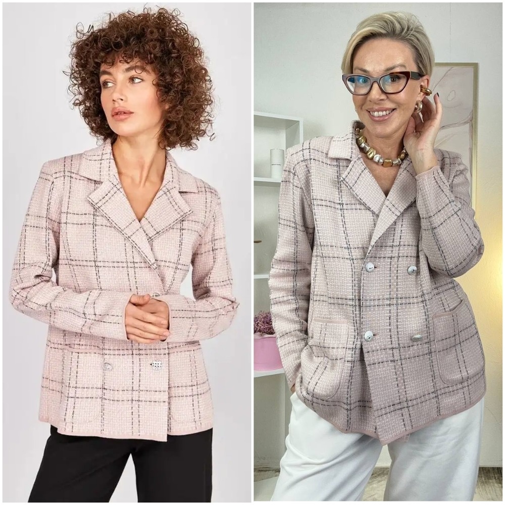 Здравствуйте, дорогие читатели! Меня зовут Ирина, я - стилист, и на этом канале показываю одежду и аксессуары с Wildberries такими, как они есть, то есть, из серии "ожидание/реальность". Мои параметры: рост 169 см, вес 67 кг, 94-74-100 ✅Основной канал: Стильно - не значит дорого! Ставьте лайк в поддержку канала, и давайте смотреть на мою сегодняшнюю покупку. Жакет Состав: 30% х/б, 70% пан Размеры: 48-60 Цена: 2543 руб Пудровый жакет в стиле Chanel: изящество в каждой детали Этот жакет действительно напоминает о классике от Шанель — те же безупречные пропорции, лаконичный крой и удивительная способность преображать образ. Нежный пудровый оттенок выглядит благородно и свежо, добавляя лицу мягкое сияние. Полуприлегающий силуэт мягко обрисовывает фигуру, не стягивая и не создавая жёстких линий. Вязка плотная, но не тяжёлая — жакет согревает, но не перегружает. Прорезные карманы с аккуратными кантами и пуговицы в тон доводят образ до совершенства, подчёркивая его цельность и продуманность.