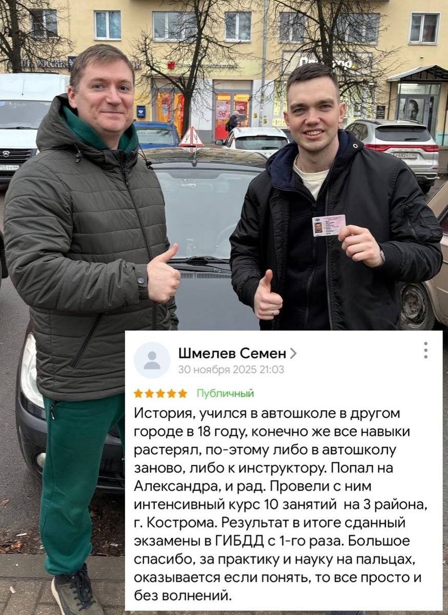 Спасибо, Семён! Рад, что твоя «история с перерывом» закончилась сдачей экзамена в ГИБДД с первого раза! 💪 За 10 занятий по трём районам Костромы ты собрал навыки заново, уверенно почувствовал наш город и спокойно вышел на экзамен — без паники, без лишних кругов, только чёткие действия за рулём. 🚗 Если кто-то тоже когда‑то учился, всё забыл или просто боится городского потока — твой результат показывает, что даже за короткий интенсив можно вернуть уверенность и спокойно сдать на права. Готов пройти такой же путь? Записывайся на уроки вождения в Костроме на автомобиле с автоматической коробкой передач и превращай свои сомнения в уверенное: «Сдал с первого раза!» 🙂 ☑️Записаться на вождение ☑️Подписаться на канал
