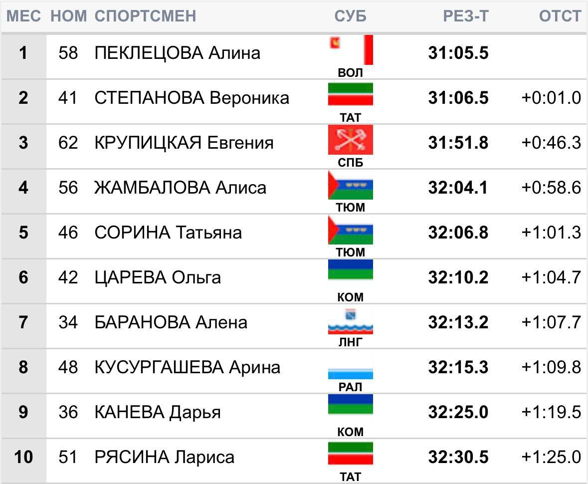III этап ФосАгро Кубок России по лыжным гонкам г. Чусовой Пермского края Формат этапа - мини-тур Индивидуальная гонка на 10 км классическим стилем. Барышни 1. Алина Пеклецова (Вологодская область) 31.05.5 2. Вероника Степанова (Республика Татарстан) +1 секунда 3. Евгения Крупицкая (Санкт-Петербург) +46.3 секунда 4. Алиса Жамбалова (Тюменская область) +58.6 секунды 5. Татьяна Сорина (Тюменская область) +1.00.3 6. Ольга Царева (Республика Коми) +1.04.7 https://live.flgr-results.ru/9365 В этом посте есть большое видео, которое не загрузилось в Дзен. Откройте оригинал поста в телеграме, чтобы его посмотреть