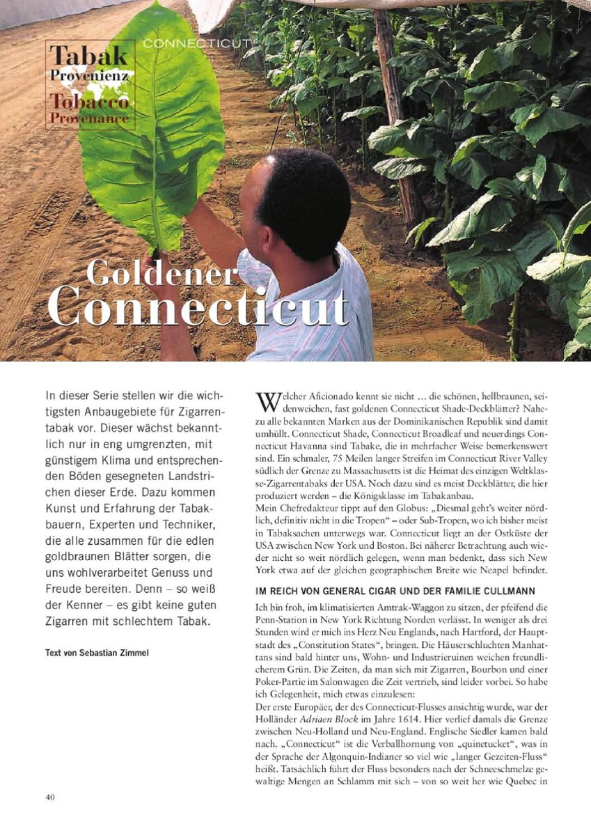 Перевод статьи из журнала European Cigar Cult Journal за 2007 год В этой серии мы расскажем о важнейших регионах выращивания сигарного табака. Как известно, он произрастает лишь на узко ограниченных, благословленных подходящим климатом и соответствующими почвами полосах земли. К этому добавляются искусство и опыт табаководов, экспертов и техников, которые все вместе создают благородные золотисто-коричневые листья, которые будучи умело обработанными, дарят нам наслаждение и радость. Ведь — как знает ценитель — не бывает хороших сигар из плохого табака. Текст: Себастьян Циммель Какой афисионадо не знает их… прекрасные, светло-коричневые, шелковисто-мягкие, почти золотистые покровные листья Connecticut Shade? Ими обернуты практически все известные марки из Доминиканской Республики. Connecticut Shade, Connecticut Broadleaf и, в последнее время, Connecticut Havanna — табаки, примечательные во многих отношениях. Узкая, 75-мильная полоса в долине реки Коннектикут к югу от границы с Массачусет