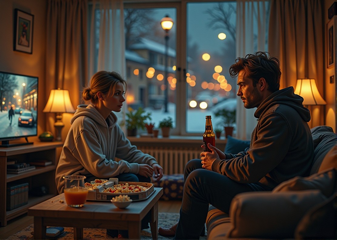 За окном снег валил всё так же. В комнате было по‑домашнему тесно от запахов, тепла, недосказанных слов. Телевизор чёрным прямоугольником отражал их силуэты: двух людей, которые внезапно увидели друг в друге не только мужа и жену, но и тех самых, кто в кино обычно оказывается «на стороне».