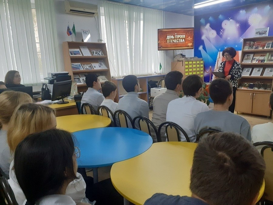 9 декабря наша страна ежегодно отмечает памятную дату — День Героев Отечества. В этом году в Энемской детской модельной библиотеке прошел патриотический час «Честь и слава героям». Учащиеся 9 «А» класса СШ №6 познакомились с историей возникновения этого значимого праздника. Библиотекарь Челебий Мариет Азметовна рассказала о Героях разных эпох — от защитников древней Руси до современных военнослужащих, проявивших мужество и отвагу. В ходе мероприятия состоялся разговор о Героях современной России, о тех, кто сражался и сражается за наше будущее и мирное небо над головой. Также была поднята тема военных подвигов в зоне специальной военной операции. Завершилось мероприятие обзором книжной выставки «Пусть мужество ваше нам будет примером», на которой были представлены книги о героях-земляках и их подвигах.