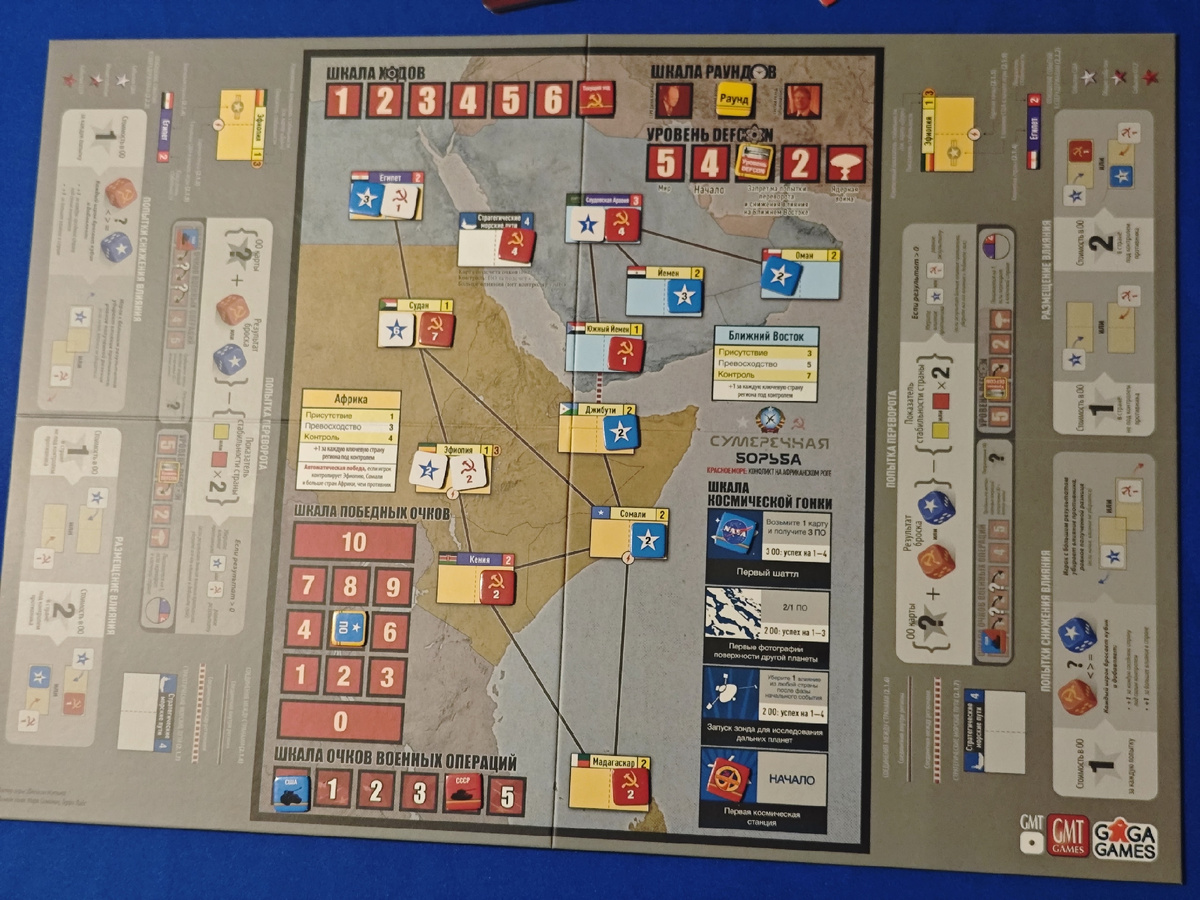 Сыграли вчера с Вадимом в Сумеречная борьба. Красное море. Правила игры совпадают на 95% с оригинальной СБ, но появились некоторые нюансы по типу горячих точек. Если в момент подсчета ПО в Африке вы владеете бОльшим количеством стран + контролируете обе горячие точки, вы автоматически побеждаете. Подробнее расскажу в полноценном обзоре. Карта теперь представлена двумя основными регионами, Африка и Ближний восток, а также есть локация Морские торговые пути. Египет считается локацией как Африки, так и Ближнего востока. Все события в игре также новые и затрагивают они лишь среднюю и позднюю часть войны. Все подробности, как и написал выше, расскажу в обзоре. Вадим до этого не играл в оригинальную СБ, поэтому правила ему дались с трудом. Но ничего, в ходе партии разобрался. Изначально я неплохо так доминировал в Африке. У меня на руках была карта подсчета очков в Африке. В теории я мог бы победить на пятом ходу, так как я контролировал больше стран + обе горячие точки. Но тогда бы Вад