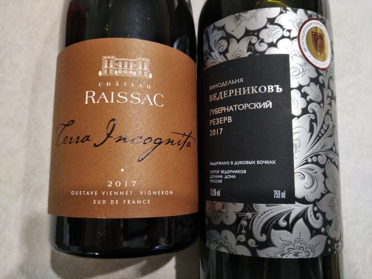 Оба вина 2017 года - выпил, чтобы не переживать за дальнейшее хранение. "Ведерниковъ. Губернаторский резерв" изготовлен из сортов красностоп, каберне-совиньон, цимлянский чёрный, разлит в сентябре 2020 года. Ягодно-фруктовое вино, в смысле, аромат. Перезрелый вариант. Сушеные ягоды, сухофрукты, чернослив. Ваниль. Может быть, кофейные нюансы. Вкус полный, насыщенный. Танины шелковистые, очень мягкие. По долгом развитии табачные и копчёные нотки. Послевкусие с легчайшей кислинкой и легкой вязкостью танинов, продолжительное. Вино в отличной форме, богатое. Chateau Raissac Terra Incognita изготовлено из сортов сира и гренаш. Розлив июль-2019. Взял в "КууКлевере" ("Отдохни") после информации в их тг-канале о скидке 50% на старые позиции. Терпкие ягоды и горький шоколад основные ноты. Немного листвы. Ароматно и вкусно. По букету ожидаешь терпкости на языке, но во вкусе вино несколько проще, чем в аромате, и чем вкус "Ведерникова", что влияет на восприятие и оценку. Танины бархатистые, чуть