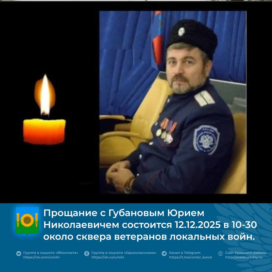 Прощание с Губановым Юрием Николаевичем состоится 12.12.2025 в 10-30 около сквера ветеранов локальных войн. #УрицкийРайон #АдминистрацияУрицкогорайонаОрловскойобласти