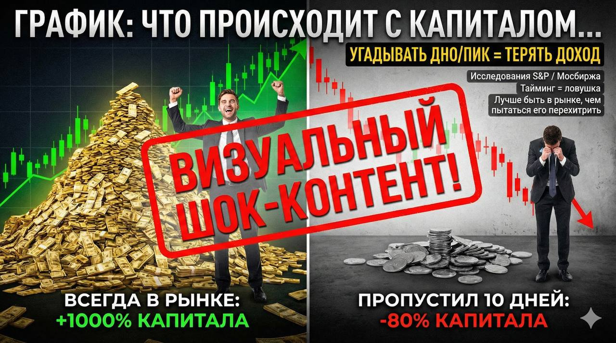 Вы когда-нибудь думали: «Сейчас рынок перегрет, выйду и зайду дешевле»? Или: «Дождусь коррекции и куплю на дне»? Вот вам жесткая правда: попытки поймать дно и пик — это самый быстрый способ убить доходность портфеля. Цифры, которые отрезвляют Исследование по индексу S&P 500 за последние 30 лет показывает шокирующую статистику: • Если вы были в рынке все 7500 торговых дней — средняя годовая доходность 9,8% • Если вы пропустили 10 лучших дней (всего 0,13% времени!) — доходность падает до 5,6% • Пропустили 20 лучших дней — доходность 2,0% • Пропустили 30 лучших дней — доходность отрицательная: -0,4% По российскому рынку картина еще жестче. Анализ индекса Мосбиржи (2010-2024) показывает: 60% годового роста приходится на 15-20 торговых дней в году. Остальные 230 дней — флэт или боковик. В чем ловушка? Вот жестокая ирония: лучшие дни роста часто следуют сразу за худшими днями падения. Они непредсказуемы и концентрированы. Пример: март 2020, пандемия. Индекс Мосбиржи обвалился на 30% за две