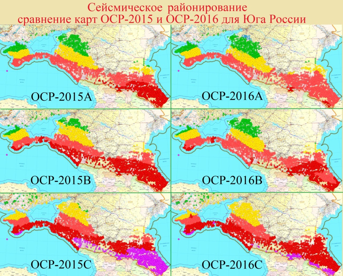 В рамках создания приложение "Живые карты сейсмического ожидания в регионах юга России" обработана информация ожидаемой сейсмической интенсивности самых южных регионов Российской Федерации. На фото представлены сравнительные данные ожидаемой сейсмической интенсивности по картам ОСР-2015А,В,С и ОСР-2016А,В,С. Результаты наводят на размышления... Работа продолжается... на очереди Республика Калмыкия, Ростовская область, Воронежская область, Астраханская область, Волгоградская область и Ставропольский край.