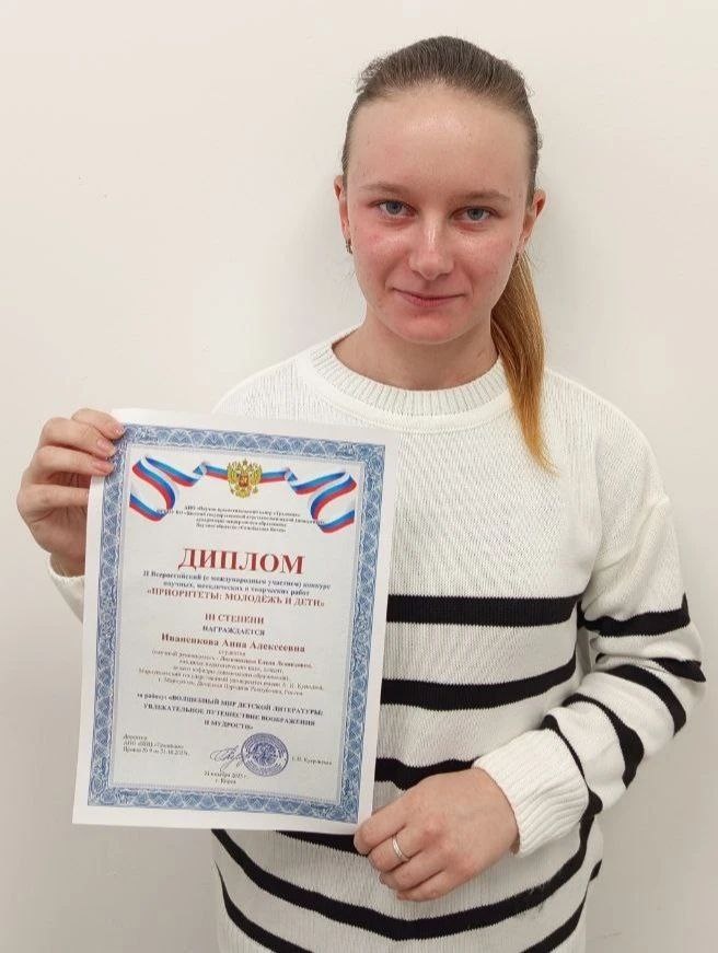 ⭐️Обучающаяся кафедры дошкольного образования педагогического факультета МГУ имени А.И. Куинджи Анна Иваненкова достойно представила университет на II Всероссийском конкурсе научных, методических, творческих работ «ПРИОРИТЕТЫ: МОЛОДЁЖЬ И ДЕТИ». 📎В рамках конкурса была продемонстрирована научно-исследовательская работа «Волшебный мир детской литературы: увлекательное путешествие воображения и мудрости». В исследовании Анна детально проанализировала, как сказки и рассказы способствуют развитию не только воображения, но и формированию таких важных основ личности, как доброта, эмпатия, честность и умение отличать хорошее от плохого. 📌Работа завоевала признание экспертного жюри и была отмечена дипломом III степени. Это достижение — яркий пример сочетания качественной теоретической подготовки и глубокого интереса к практическим вопросам воспитания детей дошкольного возраста. #МГУимениКуинджи