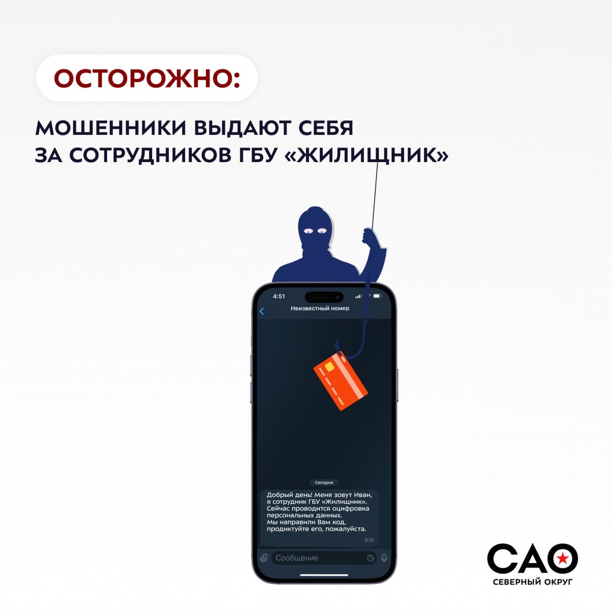 🔐 Осторожно: новая схема мошенников по сбору данных москвичей В последнее время мошенники начали писать москвичам в мессенджерах, выдавая себя за сотрудников ГБУ «Жилищник», и просят назвать код из смс под предлогом оцифровки персональных данных. Как это работает? 🔵Злоумышленники пишут жертве в мессенджере, представляясь сотрудниками ГБУ «Жилищник» 🔵Под видом оцифровки персональных данных они просят назвать код из смс, который приходит от Госуслуг 🔵После получения кода мошенник получает доступ к личному кабинету жертвы Как избежать обмана? 🔵Никогда не сообщайте коды и пароли посторонним 🔵Проверяйте информацию у официальных источников 🔵Будьте внимательны к сообщениям, которые кажутся подозрительными Будьте внимательными и берегите свои данные! 🖥 Подписывайся – Префектура САО