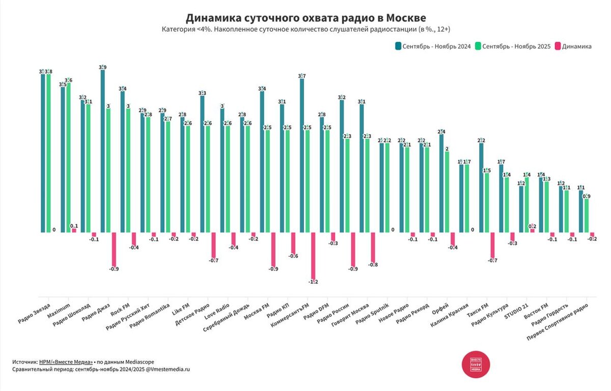 ➡️ наибольшее падение 📉 суточного охвата отмечается у радиостанций: Авторадио (-1,7), Русское Радио (-1,5), Вести FM (-1,4) и Business FM (-1,3)