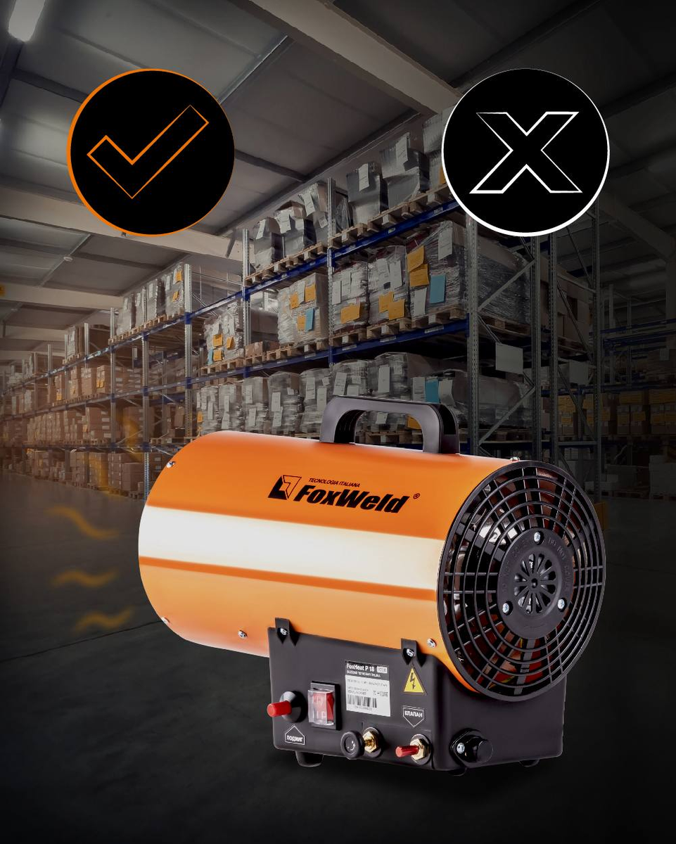 Газовые пушки FoxWeld предназначены для работы при приточно-вытяжной вентиляции, чтобы обеспечивать приток кислорода и удаление продуктов сгорания.