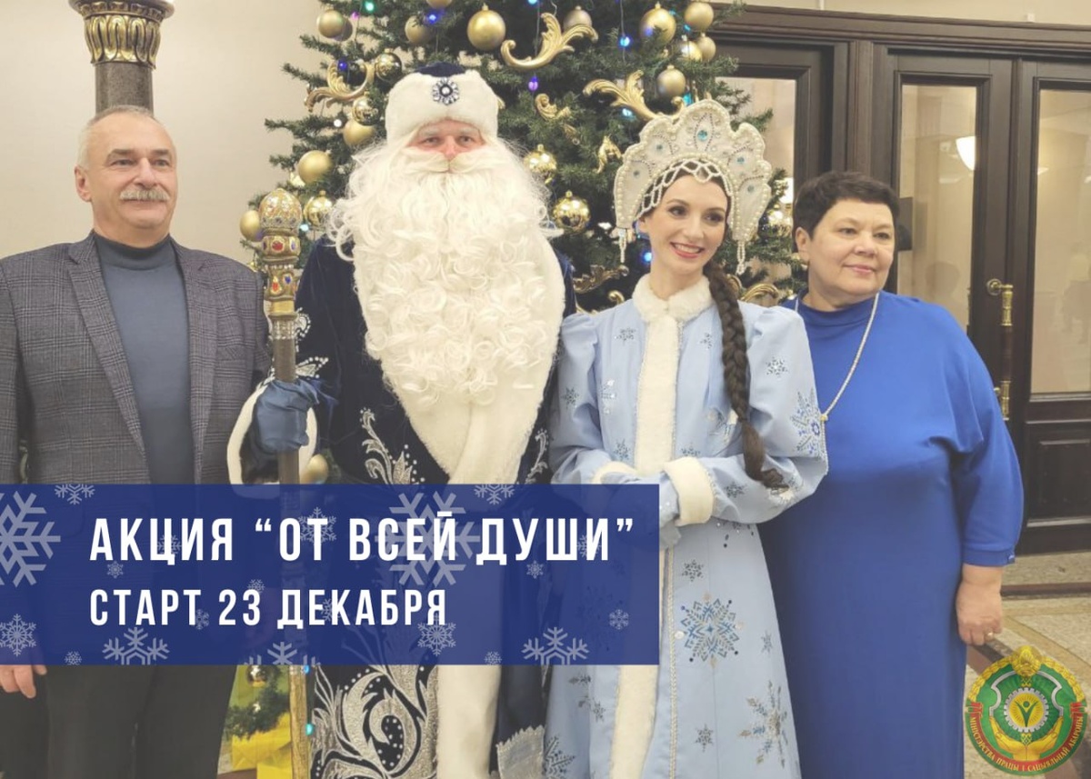 ❄️ Благотворительная акция "От всей души" стартует в Беларуси 23 декабря И пройдет по 14 января 2026 года включительно ❄️Акция проходит уже в четвертый раз. В прошлом году мероприятиями было охвачено около 500 тыс. пожилых граждан. ➡️ Основной концепт акции – проявление заботы и внимания о старшем поколении именно со стороны молодежи, вовлечение школьников и студентов в вопросы оказания им помощи и поддержки, развитие связи между поколениями. ➖➖➖ 📆 Центральными элементами акции станут традиционные единые тематические дни: В них предполагается участие более 27 тыс. человек. ➡️с 23 по 30 декабря – специальная благотворительная эстафета «Гирлянда добрых дел». 🍊Молодежь и школьники пойдут в дома к одиноким и одиноко проживающим пожилым гражданам для оказания им необходимой помощи. ✅ Наведут порядок в жилых помещениях, украсят елку, закупят продукты к праздничному столу. ✅ Создадут уют и праздничную атмосферу. ➡️23 декабря – торжественное открытие акции. 🌲 Планируется, что в меропр
