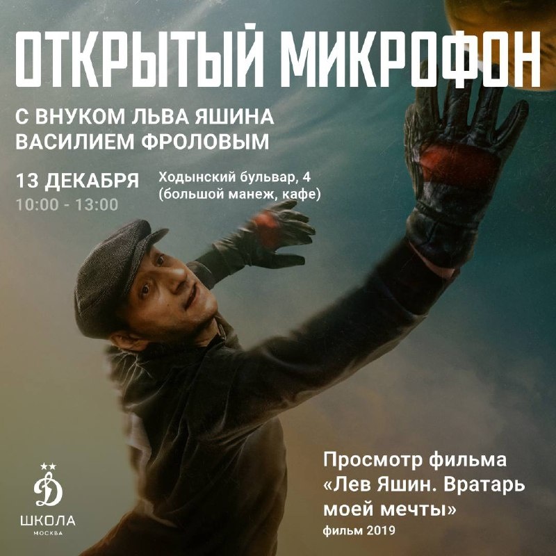 Приглашаем всех на мероприятие, посвященное легенде ФК «Динамо» Москва - Льву Яшину 🔥 🔹Когда: 13 декабря 🔹Где: Ходынский бульвар, 4 (большой манеж, кафе) 🔹Время и программа: — 10:00 - просмотр фильма Лев Яшин. Вратарь моей мечты (фильм 2019); — 12:00 - 12:30 - открытый микрофон с внуком Льва Яшина - Василием Фроловым; — 12:30 - 13:00 - презентация и розыгрыш вратарских перчаток от Lev Yashin School, автограф-сессия! Это уникальная возможность для воспитанников нашей школы прикоснуться к истории 👇 Регистрация Ждем всех наших футболистов 💙