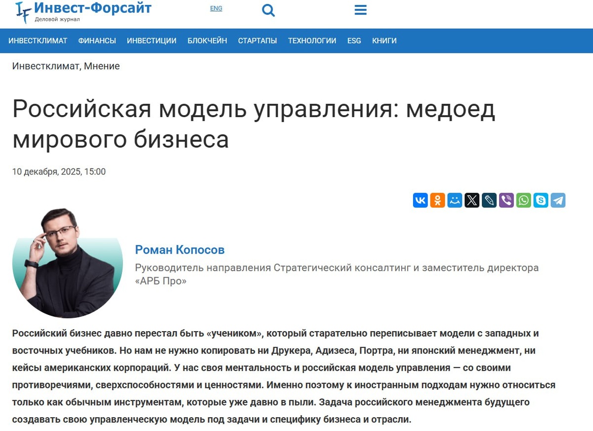 Российская модель управления = медоед в мире хаоса 🦡 Вышла моя новая статья https://www.if24.ru/rossiiskaya-model-upravleniya/ . Делюсь выводами и инсайтами русской модели управления: 📍Российская модель управления - это не «академическая теория», а медоед (зверь на фото ниже), который выживает и атакует в турбулентной среде. 📍Мы живём в режиме постоянной смены правил, поэтому ставка на СКОРОСТЬ решений, гибкость и готовность рисковать на неполной информации. В центре всегда КЛИЕНТ - под него перекраиваются продукты, процессы и иногда даже сама оргструктура. 📍Культурный код = сильный лидер + команда «своих» + человеческое отношение, которое часто важнее регламентов и должностных инструкций 📍Деньги здесь не единственная цель: предпринимателей двигают амбиции, желание «делать по-настоящему» и личная миссия. 💪Суперсила русской модели - умение держать удар, находить нестандартные решения при дефиците ресурсов и забирать возможности раньше конкурентов ⚠️ Слабое место - перегруж