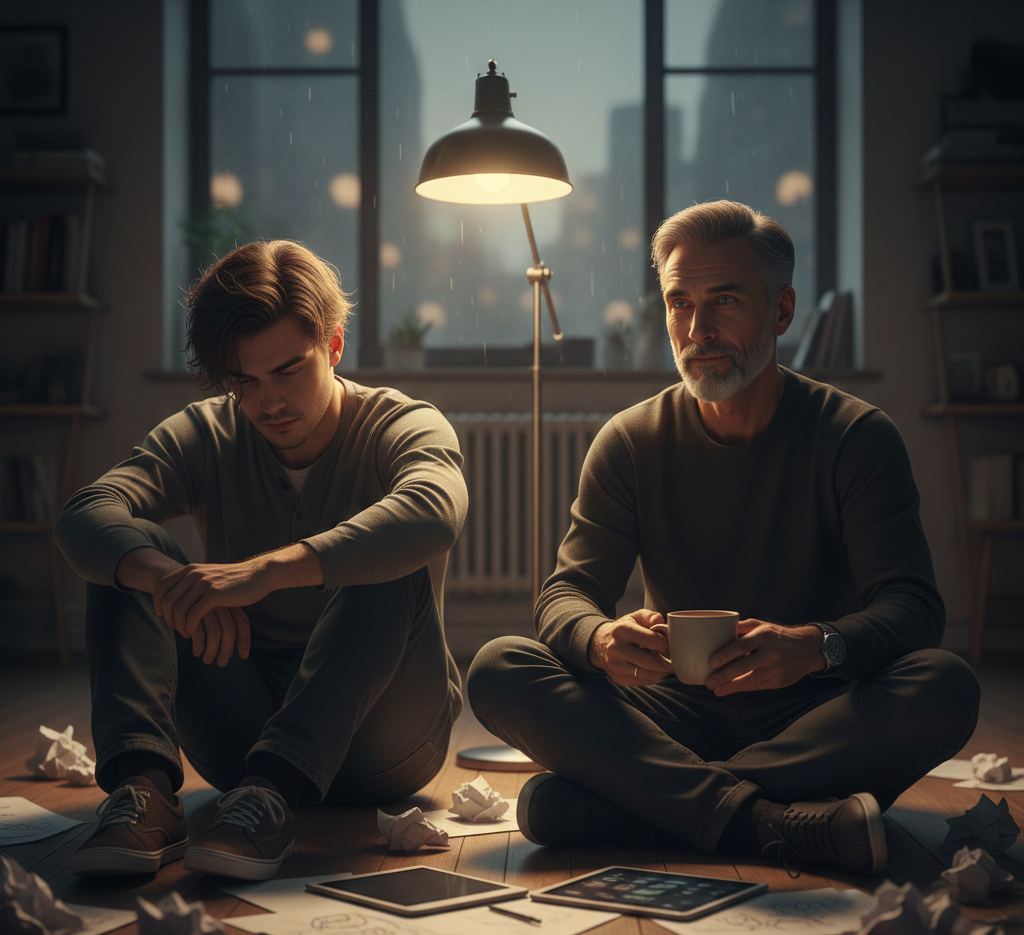 Серый, промозглый вечер накрыл город, как старое одеяло. В маленькой, освещенной лишь лампой-грибком студии, на полу сидели двое: Артём, молодой дизайнер с потухшим взглядом, и его ментор, пожилой, но невероятно энергичный Константин.