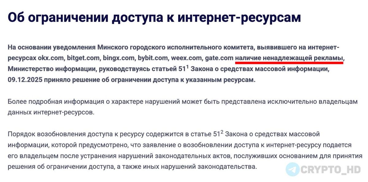 ❌🇧🇾 «Ненадлежащая реклама» – Министерство информации Беларуси объяснило причину блокировки сайтов популярных криптобирж