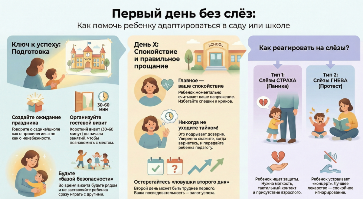 Здесь работает только одно правило: последовательность. Несмотря на слезы, ребенка нужно вести в сад/школу и на второй, и на третий день. Если вы дадите слабину и оставите его дома "отдохнуть от стресса", вы закрепите страх и сделаете адаптацию мучительной.