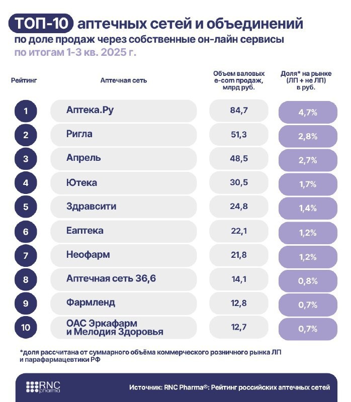 🛒 Темпы развития онлайн канала фармрозницы замедляются, но всё ещё втрое опережают общую отраслевую динамику По данным #RNCPharma по итогам 1-3 кв. 2025 г.: 📈 408,7 млрд. рублей составил общий объём онлайн продаж и бронирования продукции аптечного ассортимента (ЛП + парафармацевтика) (+34,5% к 1-3 кв. ’24) 📊 24% в руб. составила суммарная доля онлайн канала в общем объёме рынка E-com продажи ЛП 📈 15,4 млрд руб. составили онлайн-продажи ЛП с доставкой до потребителя 📊 Динамика: 48% в руб. и +3,5% в упак. к 1-3 кв. ’24 📊 1,13% составила доля e-com продаж ЛП в общем объёме российского фармрынка #ePharma #АптекаРу #Ригла #АСАпрель #Uteka #Здравсити #Еаптека #Неофарм #Аптеки36и6 #Фармлэнд #Эркафарм #МелодияЗдоровья #РейтингАС Источник: @RNCPharma Делитесь с коллегами и подписывайтесь на @pharmanalytica