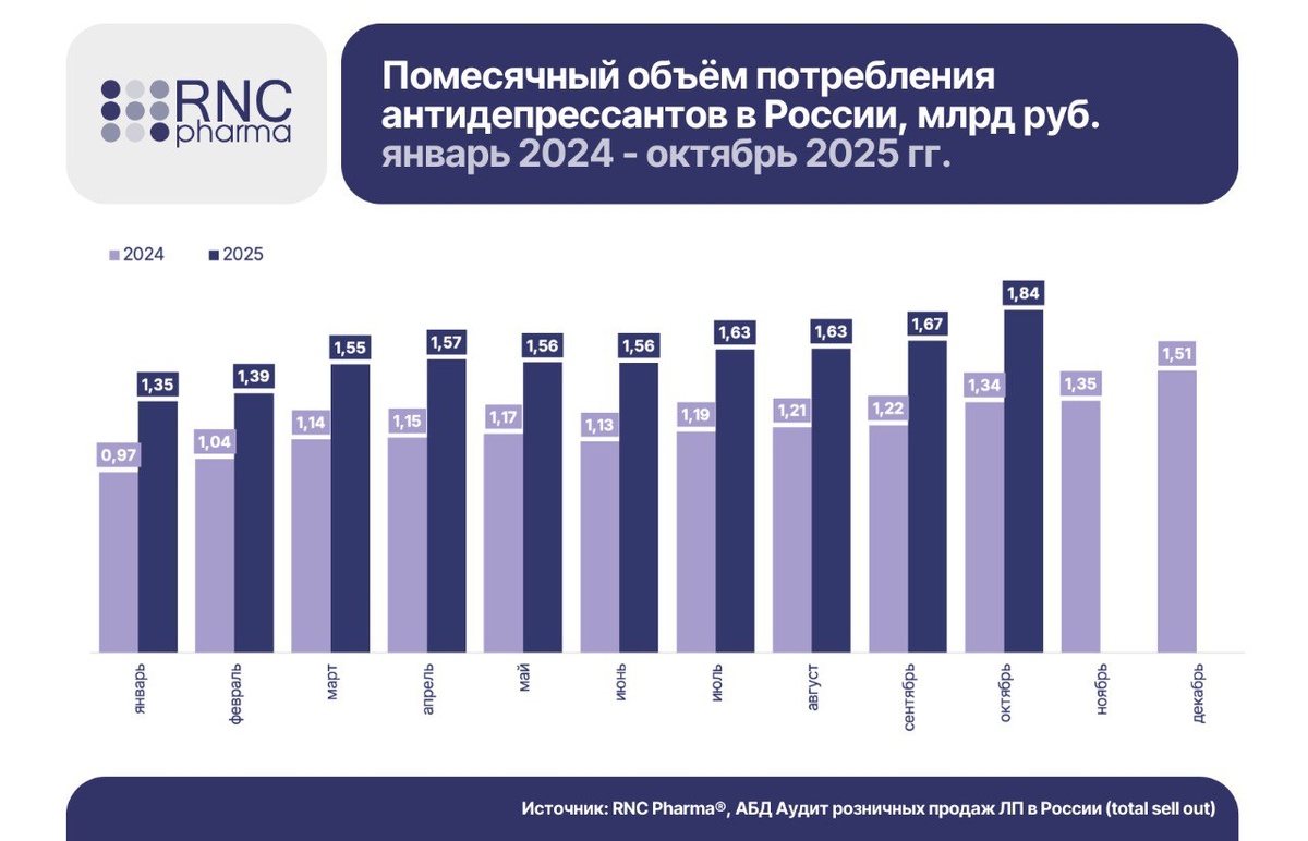 π Π ΠΎΠΊΡΡΠ±ΡΠ΅ 2025 Π³. ΠΎΠ±ΡΡΠΌ ΠΏΡΠΎΠ΄Π°ΠΆ Π°Π½ΡΠΈΠ΄Π΅ΠΏΡΠ΅ΡΡΠ°Π½ΡΠΎΠ² ΠΏΠΎΠ±ΠΈΠ» ΠΈΡΡΠΎΡΠΈΡΠ΅ΡΠΊΠΈΠΉ ΡΠ΅ΠΊΠΎΡΠ΄ ΠΠΎ Π΄Π°Π½Π½ΡΠΌ RNC Pharma Π² ΡΠ½Π²Π°ΡΠ΅-ΠΎΠΊΡΡΠ±ΡΠ΅ 2025 Π³.: π 15,7 ΠΌΠ»ΡΠ΄ ΡΡΠ±Π»Π΅ΠΉ ΡΠΎΡΡΠ°Π²ΠΈΠ» ΠΎΠ±ΡΡΠΌ ΠΏΡΠΎΠ΄Π°ΠΆ Π°Π½ΡΠΈΠ΄Π΅ΠΏΡΠ΅ΡΡΠ°Π½ΡΠΎΠ² (N06A ΠΏΠΎ EphMRA) Π½Π° ΡΠΎΡΡΠΈΠΉΡΠΊΠΎΠΌ ΡΠΎΠ·Π½ΠΈΡΠ½ΠΎΠΌ ΡΡΠ½ΠΊΠ΅ (+36% ΠΊ ΡΠ½Π²-ΠΎΠΊΡ β24) π19,1 ΠΌΠ»Π½ ΡΠΏΠ°ΠΊΠΎΠ²ΠΎΠΊ Π±ΡΠ»ΠΎ ΡΠ΅Π°Π»ΠΈΠ·ΠΎΠ²Π°Π½ΠΎ (+24% ΠΊ ΡΠ½Π²-ΠΎΠΊΡ β24) π 88 ΡΠΎΡΠ³ΠΎΠ²ΡΡ