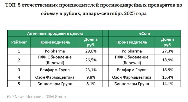За пять лет доля аптечного ecom в группе противодиарейных средств выросла более чем в два раза Аналитики #DSMGroup представили обзор аптечных продаж #противодиарейные лекарственных препаратов по итогам 9 мес. 2025 г. Объем реализации группы в аптеках составил около 8,4 млрд руб. в розничных ценах или 31,4 млн упак. (+20,1% в руб., -1,8% в упак. к 9 мес. 2024 г.). ➡️Доля онлайн-бронирования противодиарейных препаратов за пять лет выросла более чем в два раза в рублях (с 6,2% до 12,9%), а в упаковках к 2025 году составила практически 10%. Покупатели используют такие ресурсы, как #АптекаРу, #Мегаптека, #Expero.ru и другие. Доля импортных препаратов от диареи превалирует в продажах (83% в руб.), в упаковках же доля смещается в сторону отечественных средств (доля 59%). Средневзвешенная стоимость упаковки импортного ЛП составляет 538 руб., отечественного – 78 руб. 🔹 Среди компаний, производство препаратов которых осуществляется на территории России, лидирует #Polpharma, как в целом в ап