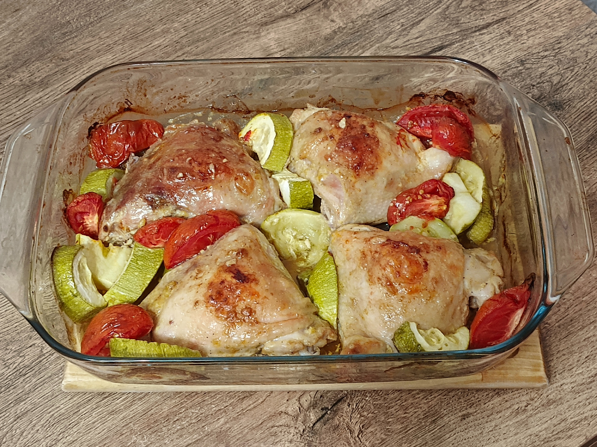 Сегодня, думая о том что приготовить на ужин - решила , что он должен быть лёгким, ароматным и главное не требующим долгих хлопот. Прекрасным решением стали куриные бёдрышки запечённые с кабачком и помидорами в духовке. ✅ Первым делом я занялась подготовкой бёдрышек: помыла, обсушила бумажным полотенцем и приступила к маринованию. Бёдра посолила, поперчила, выдавила свежий чеснок, добавила паприку, горчицу, майонез. Всё тщательно перемешала и оставила мариноваться на 1 час. ✅ Затем приступила к подготовке овощей. Сначала я их помыла. Кабачок нарезала крупно, так как мы любим чтобы после приготовления оставалась небольшая хрустинка. Яркие, сочные помидоры порезала на четвертинки. Я хотела , чтоб овощи сохранили свою текстуру, а не превратились в кашу. Поэтому не надо их слишком мельчить. Овощи немного посолила, поперчила и сбрызнула растительным маслом. Можете добавить свои любимые приправы. ✅ Теперь настал момент сборки блюда Я взяла глубокое блюдо, выложила сначала бёдрышки, а м