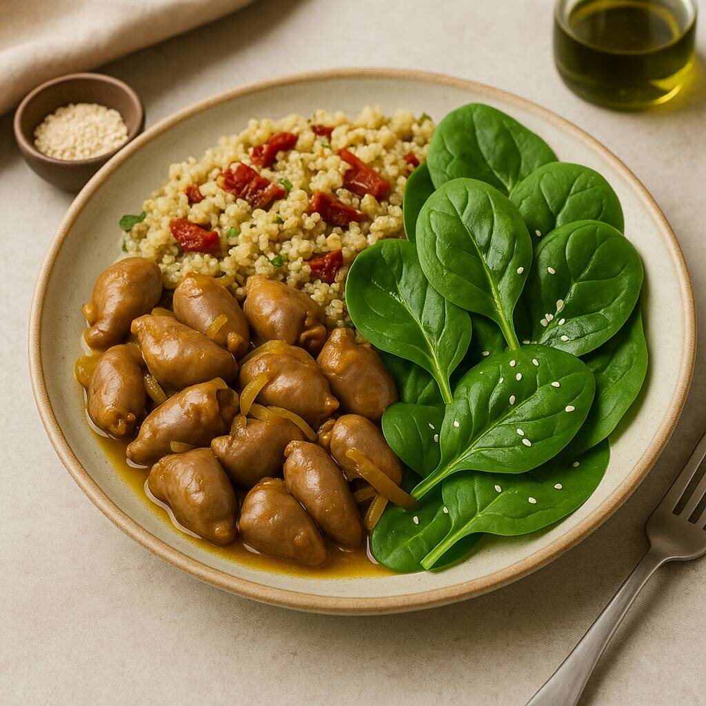 Многие ищут завтрак, который даёт сытость, энергию и не вызывает желание перехватить что-то сладкое уже через час. Такой завтрак действительно существует — и он проще, чем кажется. Сегодня делюсь сочетанием, которое идеально подходит для завтрака, обеда или ужина и даёт норму белка + долгие углеводы + клетчатка = стабильная энергия без скачков аппетита. 100 г куриных сердечек 120 г киноа горсть шпината немного тыквенного масла ½ ч. л. кунжута 🥘 Как приготовить куриные сердечки, чтобы получилось вкусно Ингредиенты: 500 г куриных сердечек 2 луковицы 2 ч. л. куркумы 2 ст. л. оливкового масла (подойдёт и масло из-под вяленых томатов) 1 ч. л. соли Пошаговый рецепт: Хорошо промойте сердечки под проточной водой, обсушите на бумажных полотенцах. Разогрейте масло в сковороде с высокими бортами. Добавьте нашинкованный лук и куркуму, слегка обжарьте. Выложите сердечки, перемешайте, накройте крышкой и тушите 10 минут. Добавьте кипячёной воды так, чтобы она покрывала сердечки на ¾. Тушите ещё 35