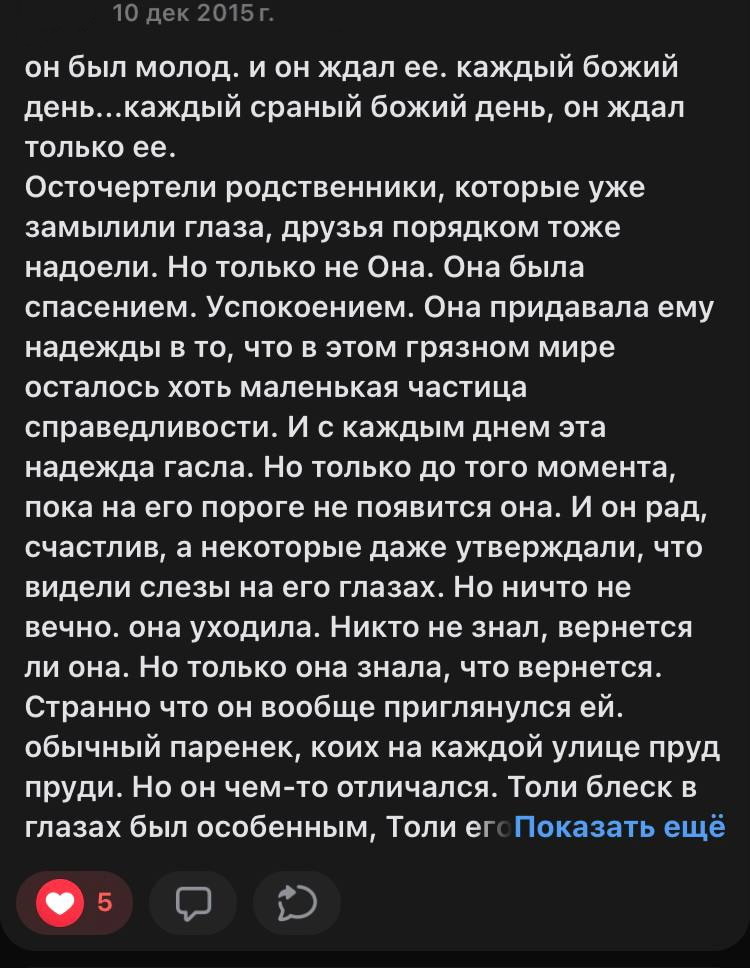 Может, потому что другой, некогда близкий мне человек, сказал, что г**но я, а не писака, и всё моё вдохновение было только в женщине. Разумеется, эти слова были сказаны не в проброс, не в качестве шутки, а в момент моей максимальной уязвимости и слабости. Благо я вычеркнул этого человека из своей жизни.