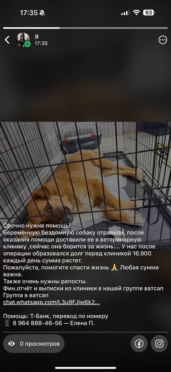 Астрахань 🆘 Срочно нужна помощь‼️ Беременную бездомную собаку отравили ,после чего ей оказали первую помощь и доставили в больницу ,ей сделали операцию,сейчас она борется за жизнь! У нас после операции образовался долг перед клиникой 16900 и с каждым днем долг растет ,хотя очень много лекарств которые мы сами им предоставляем. Вся терапия приостановлена, до полного погашения задолженностей за стационарное лечение. Распоряжение руководства. Даже еду с водой и пеленки которые мы покупали убрали. Пожалуйста,помогите спасти жизнь🙏🙏🙏Любая помощь важна.Также нужны репосты. Помощь: Т-банк,перевод по номеру телефона 89648884656 Елена П.