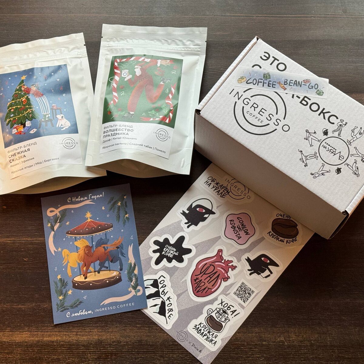 🗒 Приехал Ingresso От Ingresso Coffee приехал набор кофейного бинго (bean-go) и два новогодних бленда под фильтр. В коробке ещё были новогодняя открытка и фирменные наклеечки. Кофейное бинго – это пять секретных лотов, для которых надо угадать страну происхождения. Ответы принимают до 12 января, поэтому в праздники будет чем заняться. Такой набор – очень классный вариант проверки собственных сенсорных навыков. В прошлый раз мне повезло угадать 4 из 5, чему я был очень рад! Новогодний bean-go обещают в продаже с завтрашнего дня, а сегодня можно сделать предзаказ. P.S.: На кофе от Ingresso у меня есть промокод. Ищите его в старых постах или на сайте. @Кофезавр