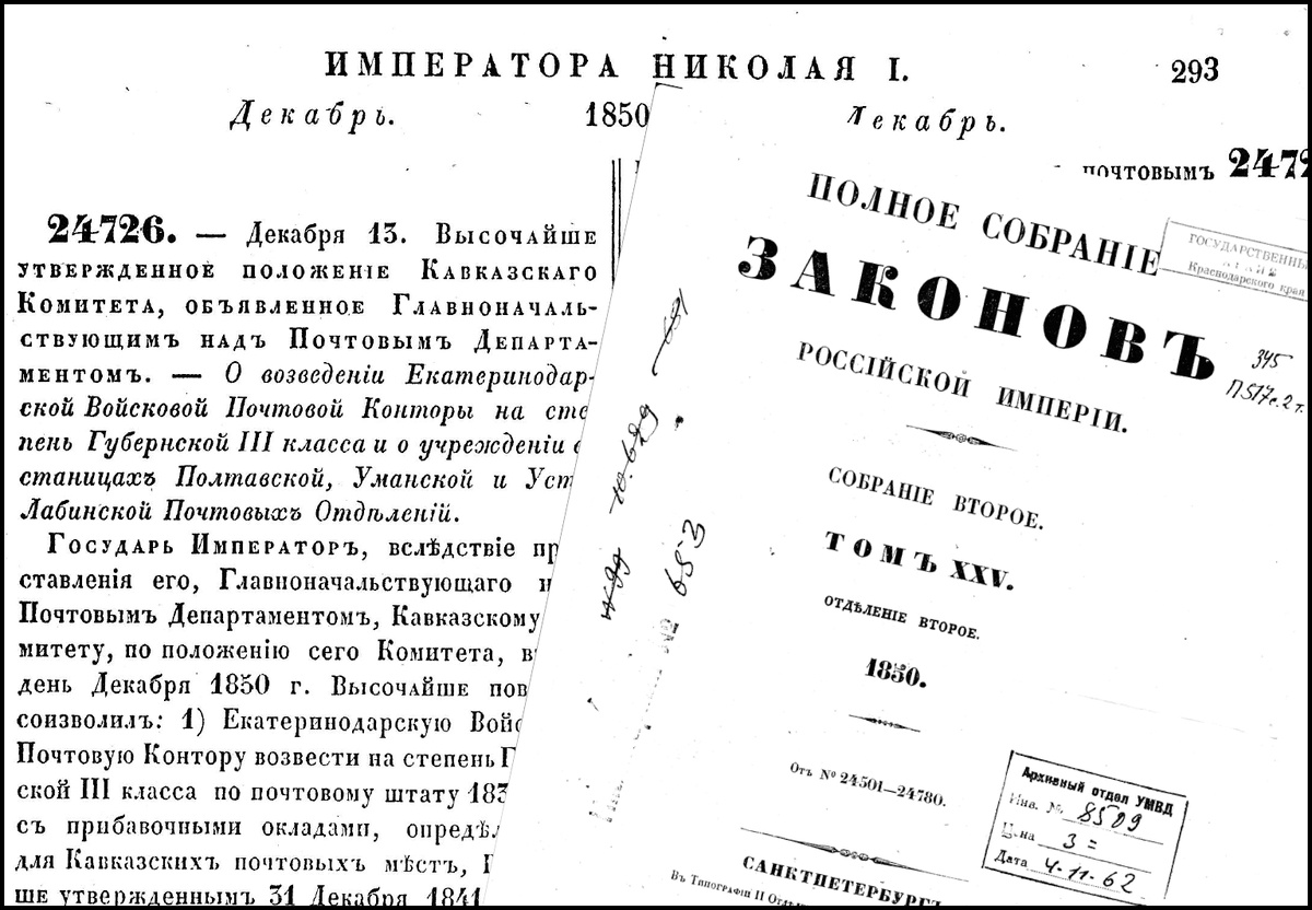 «Высылаем Вам копию «Положения Кавказского Комитета – О возведении Екатеринодарской Почтовой конторы на степень Губернской III класса и о учреждении в станицах Полтавской, Уманской и Усть-Лабинской Почтовых Отделений» от 13 декабря 1850 года», – гласил официальный ответ.