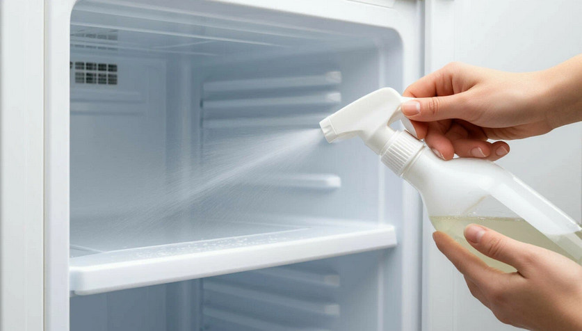 Нанесите раствор. Распылите состав из пульверизатора на абсолютно сухие внутренние стенки морозилки, кроме области с электрическими элементами (если они видны). Достаточно легкого влажного слоя. Не нужно заливать поверхности.