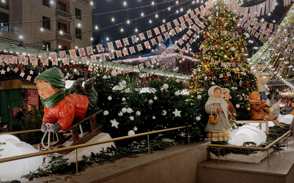 Начало декабря, новогодние декорации Москвы уже разведены, а толпы туристов ещё не на бежали. Мы успели прогуляться до большой толпы и получить заряд новогоднего настроения и сказочного торжества. Ёлка на Манежной площади оформлена в духе советских ватных игрушек, только эти игрушки большие и яркие, очень замечательно создают праздничный настрой, напоминаю давно забытые игрушки из раннего детства или даже из детских стареньких книжек наших мам и бабушек. Дальше мы зашли в ГУМ, а там целая галерея ёлок, оформленных разными фирмами, брендами и организациями. Очень разнообразно и интересно. Написано пинко, и правда весь декор в розовом цвете. Словно смотрим на ёлку через розовые очки. Эту белоснежные ёлку подарил магазин, расположенный рядом. Порадовала ёлка на тарелке с гирляндами, похожими на спагетти. Тут шары - это медвежата. Фарфоровые чашки в оформлении ёлки от ленинградского фарфорового завода. Ну, птица сказочно приземлилась на верхушку это
