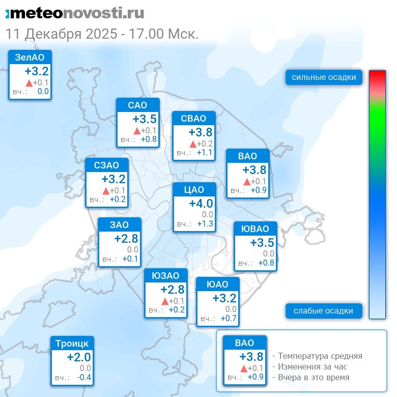 В 17:00 в Москве было от +2°C до +4.5°C, средняя температура +3.4°C #погода #Москва #зима #температура #11декабря #четверг