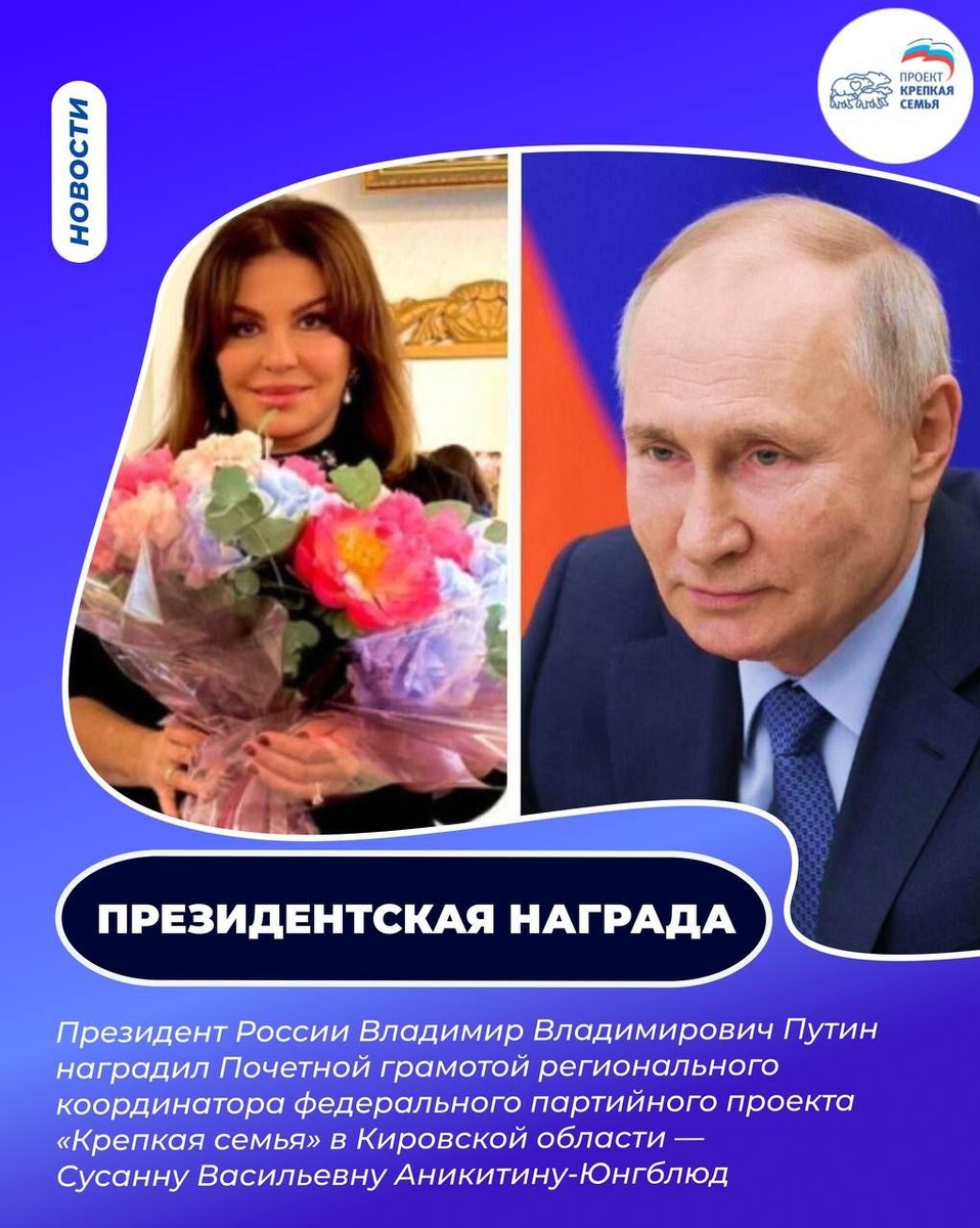 👏 Президентская благодарность — за верность делу и заботу о людях ⭐️ Высокой государственной награды — Почетной грамоты, присужденной указом Президента Российской Федерации Владимира Владимировича Путина, была удостоена Сусанна Васильевна Аникитина-Юнгблюд, региональный координатор федерального партийного проекта «Крепкая семья» в Кировской области, за заслуги в области здравоохранения и многолетнюю добросовестную работу. ✅ Признание стало закономерным итогом многолетней работы, в которой гармонично соединились: 🔹 профессионализм в сфере здравоохранения — Сусанна Васильевна возглавляет компанию «Здоровые люди» и является основателем сети клинических центров «Совермед»; 🔹 забота о людях — сеть клиник не просто обеспечивает жителей Кировской области качественной медицинской помощью, но и ведет системную работу по поддержке бойцов, вернувшихся из зоны СВО; 🔹 приверженность семейным ценностям — в учреждениях сети принципиально не проводятся аборты, а все усилия направлены на подде