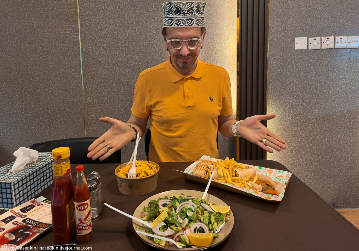 В ходе своего официального дружественного визита в султанат Оман, я (помимо прочего) поставил себе задачу изучить нетуристическую кухню, предпочитаемую местными жителями. С той лишь оговоркой, что местными мы будем считать также выходцев из Индии и Пакистана. Справедливости ради, оказалось это весьма непростой задачей, ибо кафе и ресторанов в Маскате бесчисленное множество. Как говорят на Руси - too many choices. А потому действовать я решил методом тыка. В общем, представляю вам тройку лидеров первых попавшихся заведений. Итак...