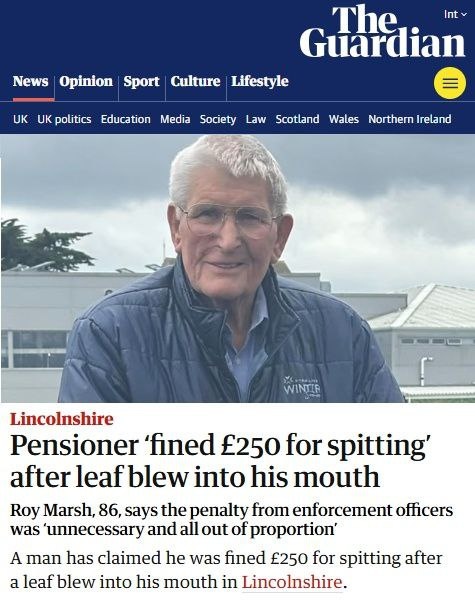 86-летний Рой Марш сидел на лавочке в родном Линкольншире, когда порыв ветра поднял с газона несколько упавших с дерева листиков и отправил их в его сторону. Один из листков попал дедушке в рот. Рой листик выплюнул и снова хотел предаться созерцанию окружающей среды, когда к нему подошел местный сотрудник по контролю за мусором и протянул штраф. В 250 фунтов (25 895 руб.), по решению сотрудника, обошелся мужчине плевок листком. Добропорядочный гражданин Рой Марш конечно возмутился такой несправедливости. И даже подал на апелляцию. Штраф удалось снизить до 150 фунтов (16 тыс. руб). Но платить все равно пришлось.