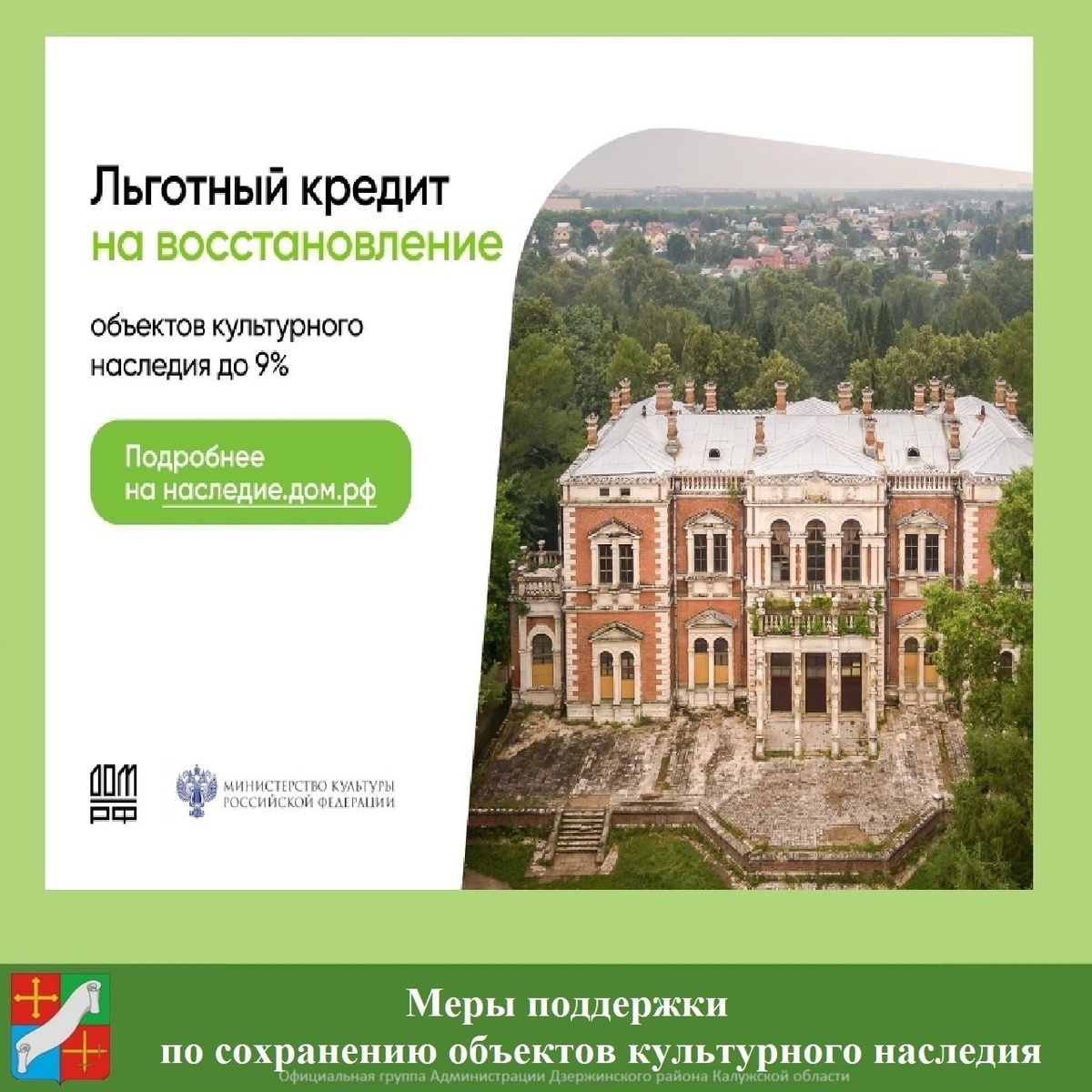 Министерство культуры России совместно с ПАО «ДОМ.РФ» подготовили два новых графических баннера, содержащих информацию о мерах поддержки по сохранению объектов культурного наследия. Они посвящены: 🔹Программе льготного кредитования для проведения работ по сохранению объектов культурного наследия (ОКН); 🔹Мерам государственной поддержки, которые помогают восстановлению и сохранению исторических зданий. Материалы содержат удобную ссылку на портал https://clck.ru/3FLyFt Здесь размещена вся подробная информация.